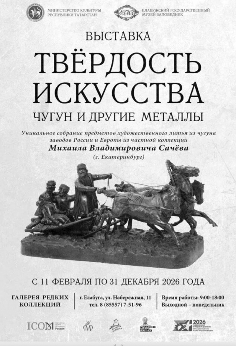 С 11 февраля по 31 декабря 2026 года в Елабуге будет проходить уникальное событие. Выставка представит частную коллекцию уральского казака Михаила Владимировича Сачёва из Екатеринбурга — грандиозное собрание предметов художественного литья из чугуна. Это не просто заводские изделия, это настоящие произведения искусства, созданные на заводах России и Европы.