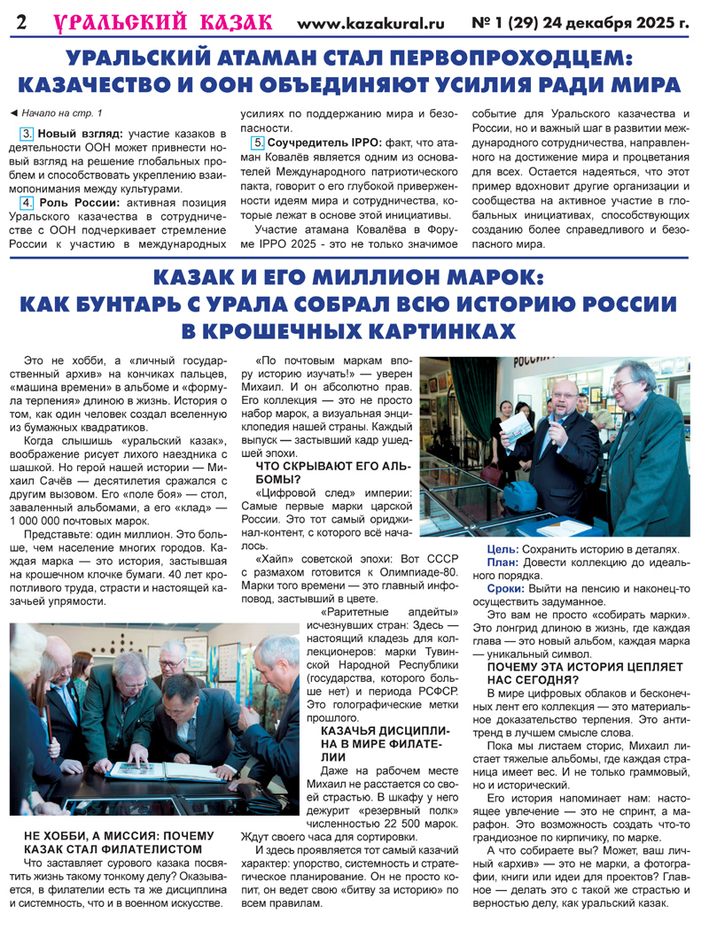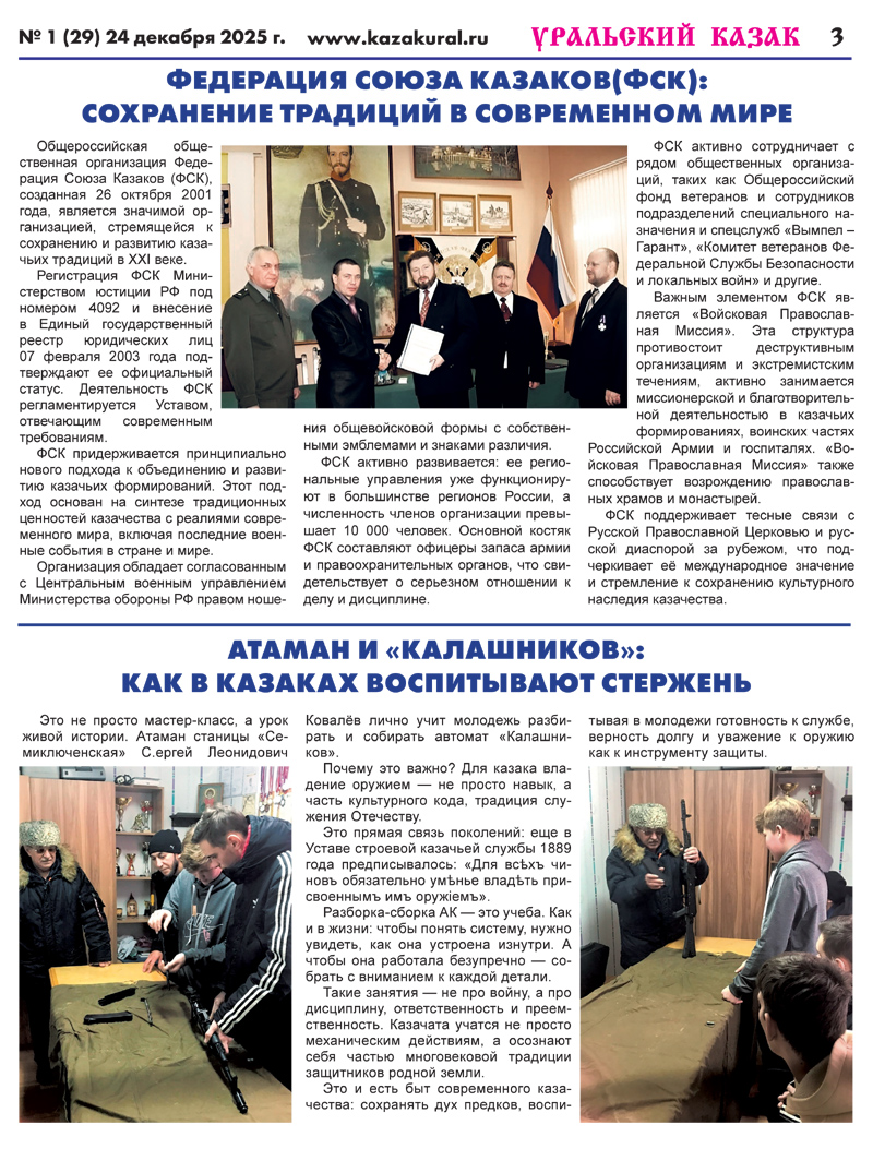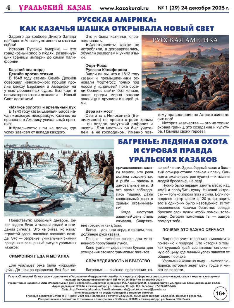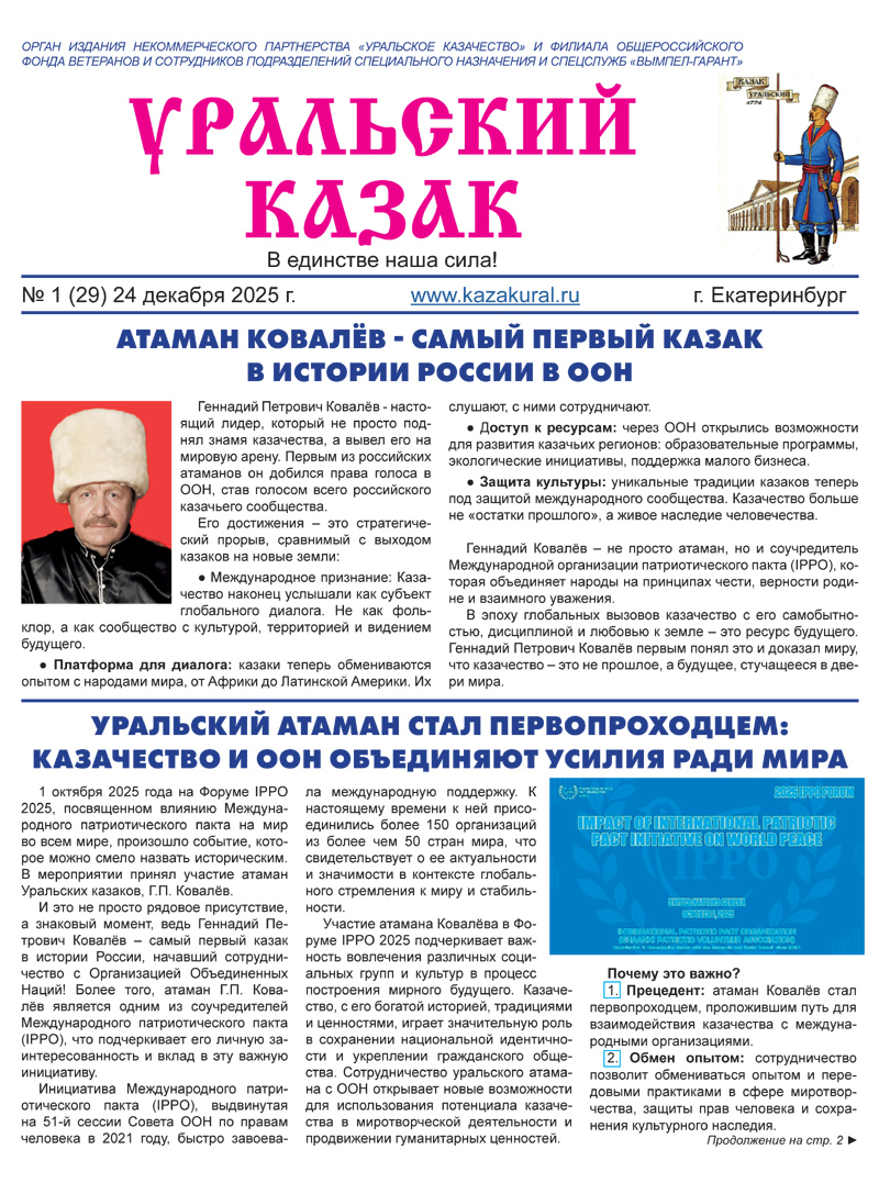 Уральское казачествоимени Августейшего атамана Казачьих Войск Е.И.В. Наследника Цесаревича Великого Князя Алексея Николаевича N1 (29) 24 декабря 2025 г.